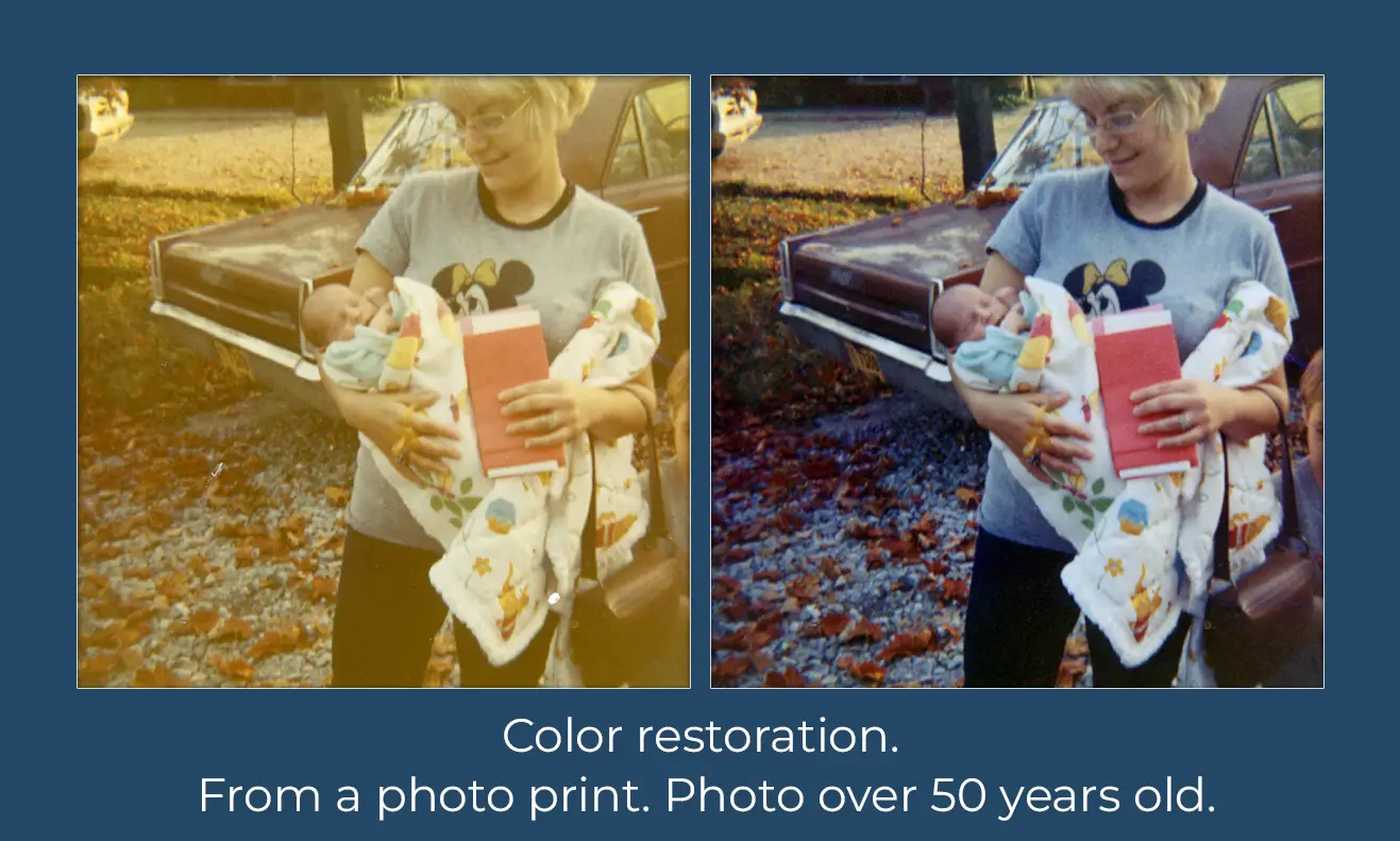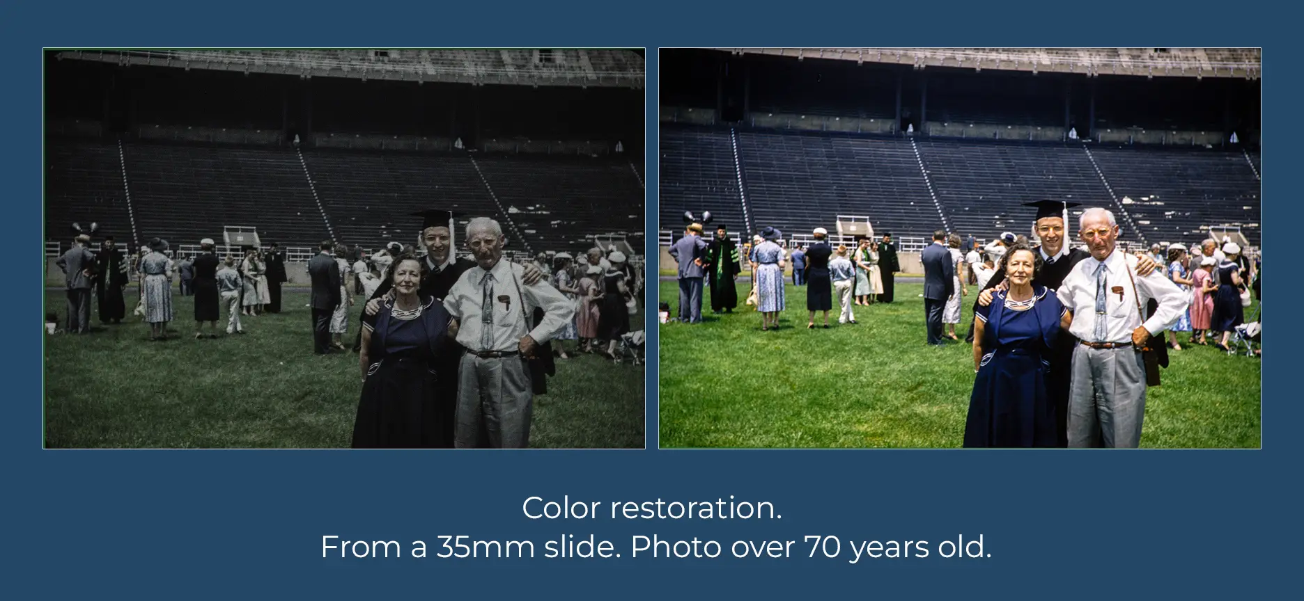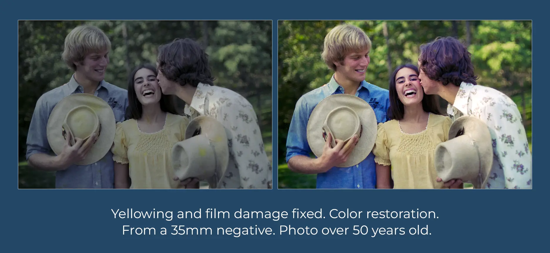That’s why I specialize in archival-quality digitization and restoration of photographs, negatives, and slides. Whether you bring me a single box or an entire estate, every image is handled personally, with the same precision, discretion, and care I’ve given my own family’s history.
